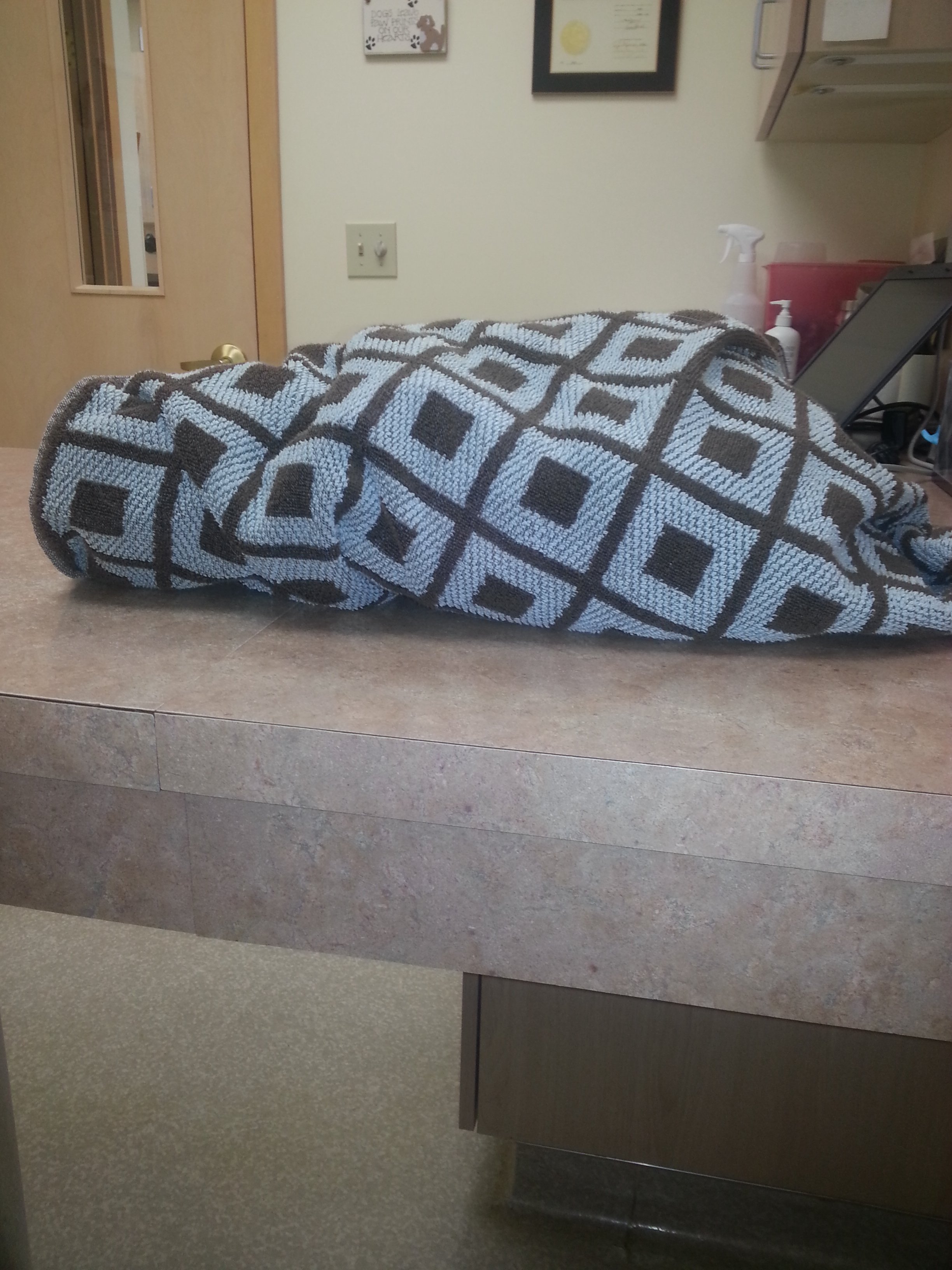 The veterinarian technician weighed Zeke. She took his temperature. Then she wrapped him in a blanket to calm him, while he waited for the arrival of the veterinarian.