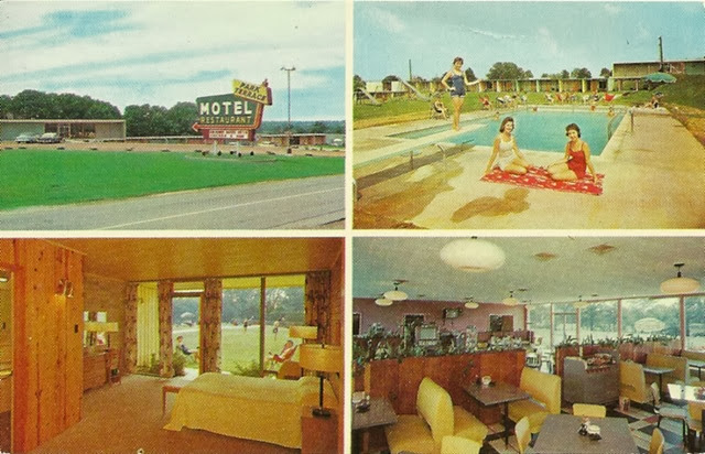 Park Terrace Motel & Restaurant, Fulton, Kentucky 1950’s. Heated swimming pool, 10 acre lawns and playgrounds, golf putting greens, Tennis Courts, Shuffleboard, Private Sun Terraces, Free TV, room telephones, Beautyrest mattresses, wall to wall carpeting, central heat & air conditioning, excellent food served.