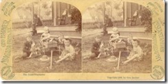 It’s title is: “The little playmates.” According to the stamps on the card, it has won numerous American and international awards, beginning in 1887. The card is finally copyrighted in 1890 by George Barker of Niagara Falls, New York.The enlarged panel is very nostalgic. We see a group of boys and girls playing with a wagon. They must sit very still and hold their pets for the slow camera lens. Playing with them, we see a dog and two cats or kittens. The father is sitting on the porch watching.