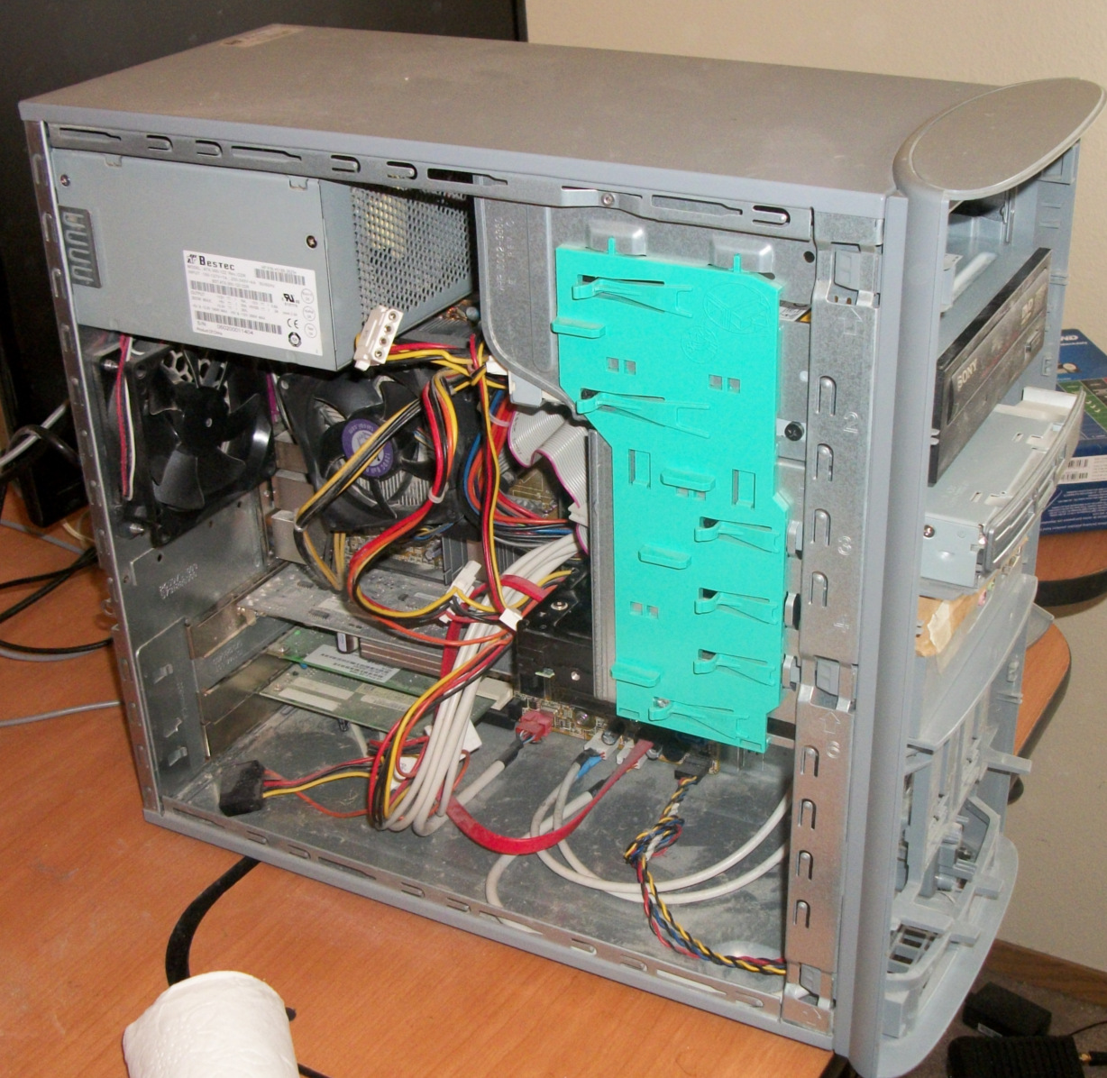 The inside needed a good cleanup! If Ant Man hacked into this computer, I would see the footprints! The old broken CD drive on the bed was not replaced. The empty slot from which it came can hold a bag of cat treats. Simply hit “eject disc” and the treats are dispensed! That is handy if a cat comes to bother you when you are busy. I should send this idea in to Red Green. I added some more memory, and bought a new keyboard. A while back I got a new monitor. Everything went back together, and there were no parts left over, which is always a good thing.