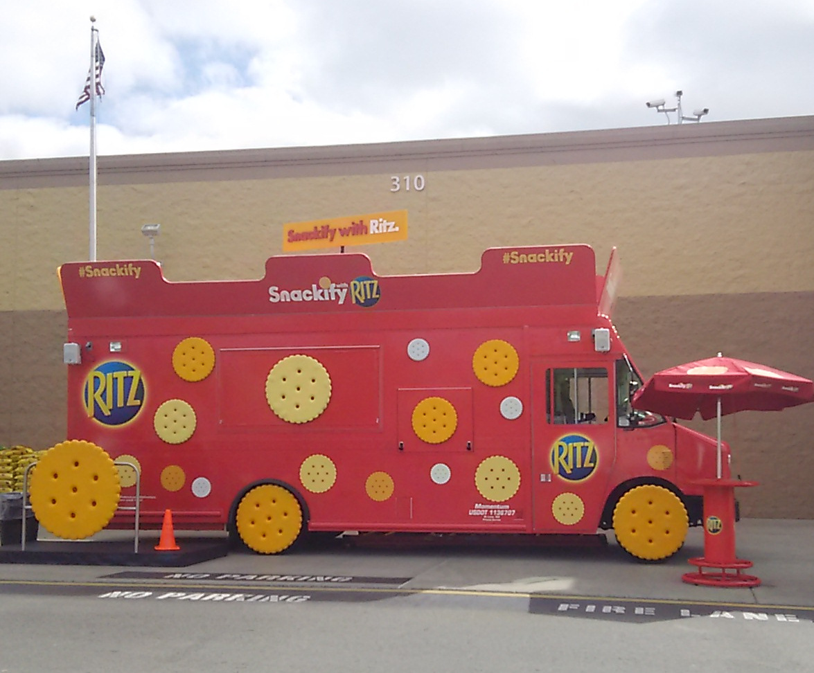 Above is the Ritz Snackify truck which travels about the country. This is a photo of it just before it opened to dispense snacks of a crackery nature. It is basically a travelling cracker “roach coach”. You are probably wondering, as I did, if the wheels and other giant crackers are edible. I decided to find out.