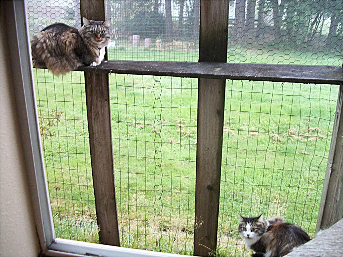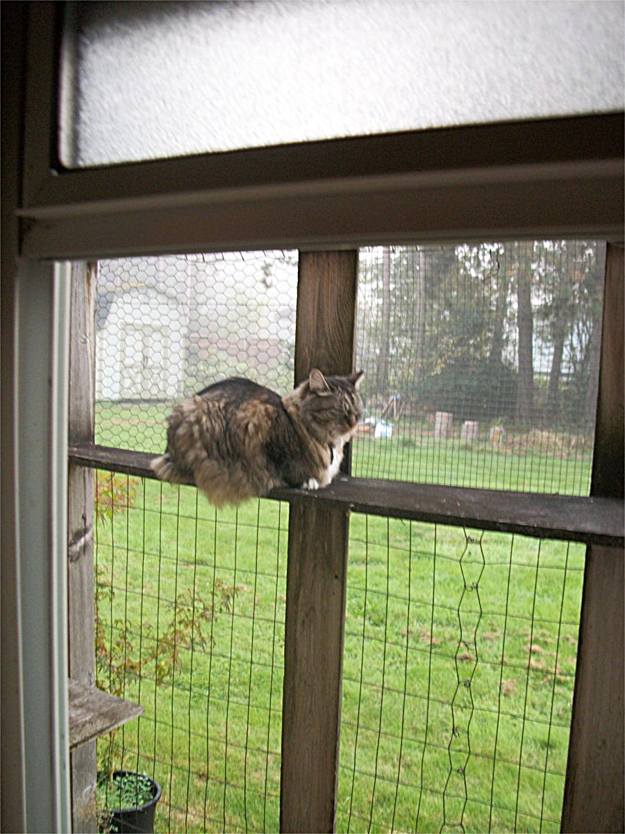 There is a post in draft about how I built the catio, which will eventually appear, complete with a couple photos. As you can probably tell, the old one has seen a lot of weather, and a brand new one is in the plans for next year. I check the old one when I am outside to be certain it is sturdy and secure.