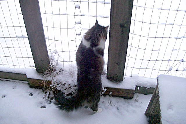Zeke likes chewing cardboard. Best not to move or disturb cats prowling around flower vases as they are surefooted. All cats watch television animal shows at night. The catio is a safe place to discover what snow is, or all weather in general.