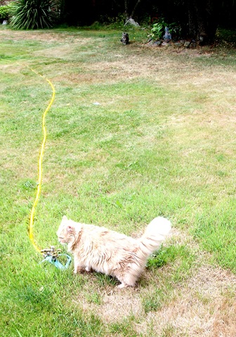 I love these pictures! Looks like Zeke may have given his box lid a few bites to make it a better “comb” for scratching his forehead. I felt a little tense, seeing Marigold inspecting the sprinkler, with Opie far away, possibly calling and calling her to get away quick in case it decides to go on! Another tense moment is not one, but two cats up winding around the flower vases–yike! Opie watching the TV is hilarious. These new HDs are so bright and clear for cats. Your “catio” looks like great winter fun, and your vintage kitty picture is so wonderful–like your meowing postcard collection! Happy September, Greg!