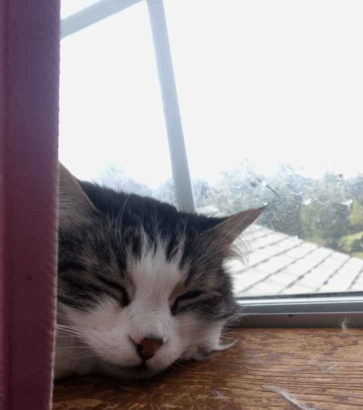 Well, Zeke got a wet outing this morning. I don’t know, but the view from the west window looks pretty nice, and it’s a perfect nap spot too. Wishing you all a break from the rain!