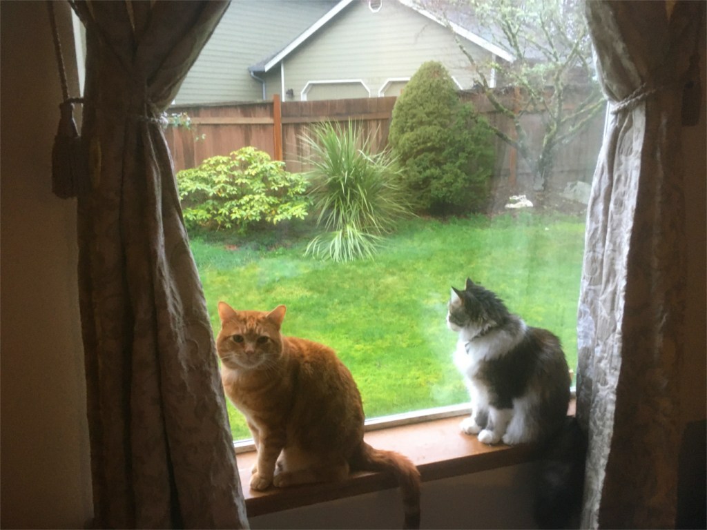 Cats and windows go together. A cat’s hunting instincts cause them to always be on the lookout for something to hunt–watching outside for some kind of movements–something to keep them from being bored inside and stimulate their minds. My catio has taken things a bit further. Indeed cleaning it out I have found dead birds and small mouse carcasses inside–the large fence wire I used allowing them easy access if they dared. I have on the rare occasion had a live bird fly through and fly around in the house! The catio is a large improvement on the window, but there is not free reign to go out. Weather is a factor and someone must be at home to have it open; therefore, the window is the good old standby always available.