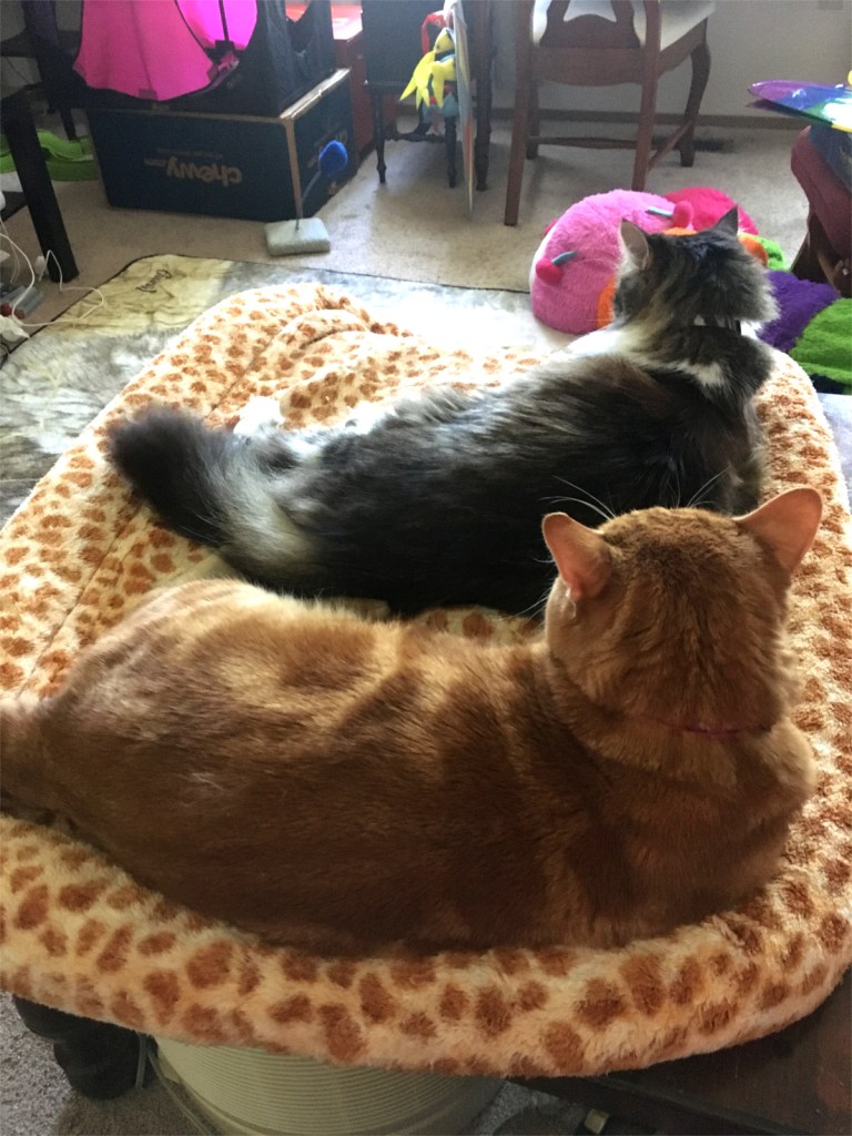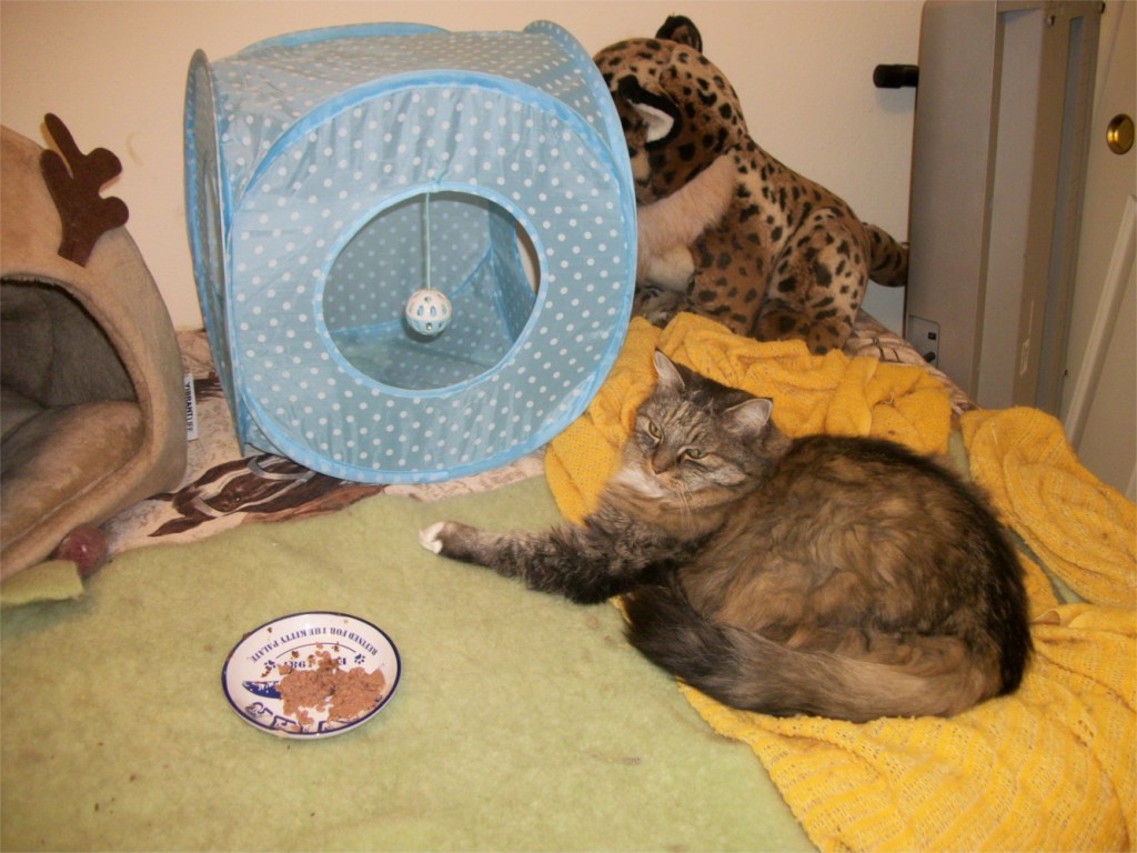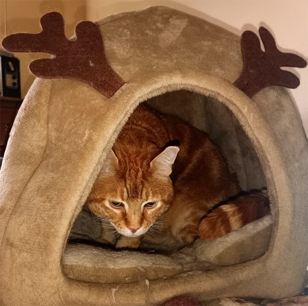 October update: I have a bunch of illnesses knocking me back so I had to stop. I felt it too drastic to delete the blog so I made it private so I can bring it back if I wish . I didn’t want it to become a ghost blog by leaving it visible and abandoned. Cat wise, Scooby came down with Cholangiohepatitis. He would not eat. Had to feed him special food by syringe every 2 hours. That was tough. Eventually antibiotics kicked in and he could eat again. Lots of medications and lots of money but he is over it. It was a close call. Zeke jumped down into the catio and hurt his front paw. X-rayed and apparently no damage. Was ok in a week. Catio is closed and falling apart from neglect. Finally Opie who won’t allow brushing got full of hair mats and went to the groomer and got them shaved off and is happier now. She is still in her room mostly sleeping in her reindeer tent with the shark and her other stuffies.