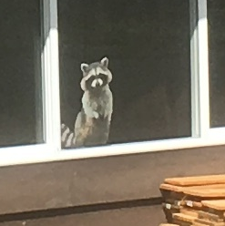 Scooby–not worried by raccoons. Chilling out in the kitchen coffee bar.Dreaming of outlaw adventures . . . . . .