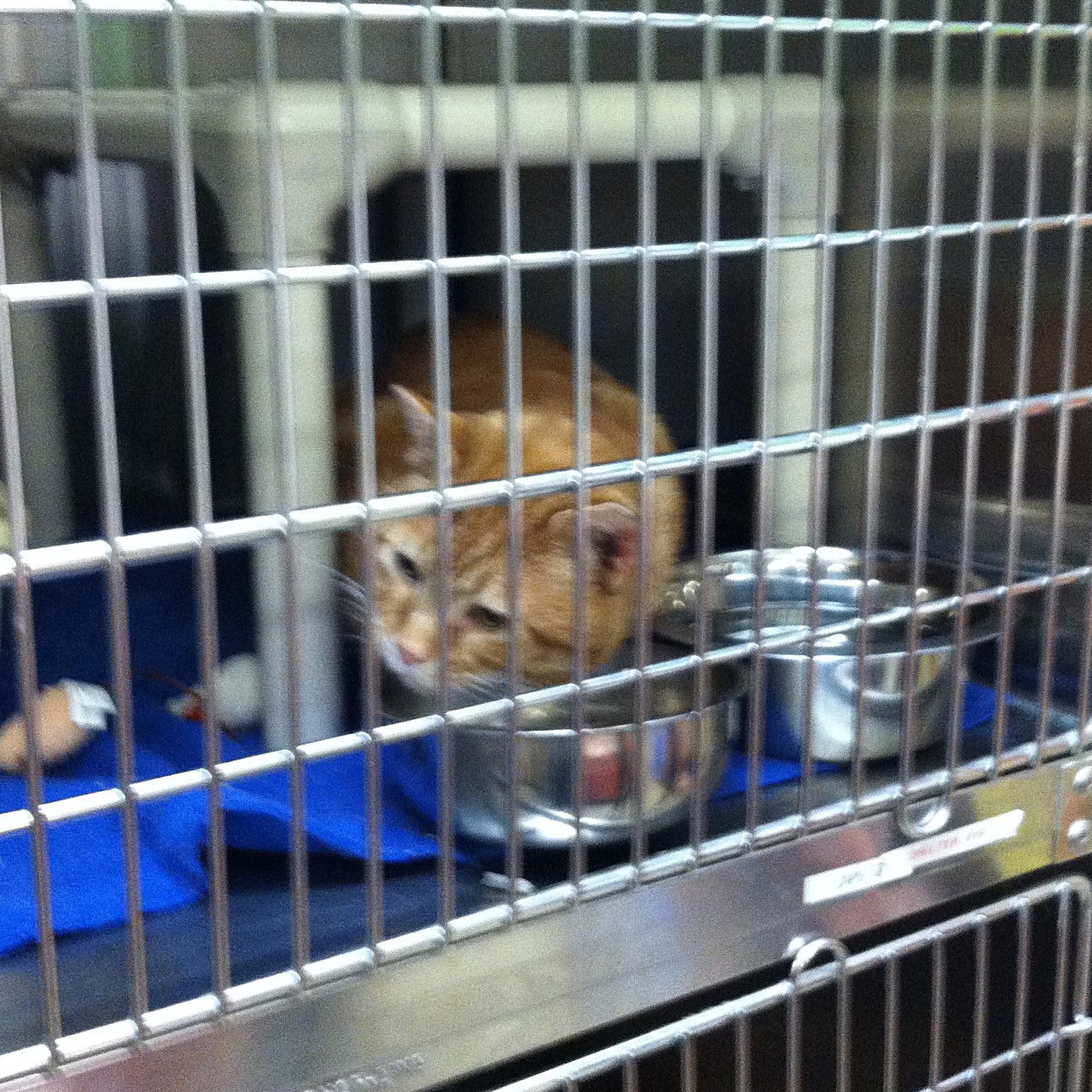 He cost $80 US to adopt. He had a FIV test, and all his shots, plus a microchip implanted. I got a copy of his records for my vet. He had been spayed earlier in his life. The lady showed me which dry cat food he had been eating. It was “Simply Nourish Source” cat food. Amazingly, that is the food I give my cats, and I have a large supply of bags of it at home! I would not have to be serving two different kinds of food. I was given coupons for many products free or with $ off. I used a free coupon for yet another bag of dry food, but I wanted to get out of there and get him home soon. We put him into my cat carrier. He weighs 14+ pounds and is a big fellow–all muscle!