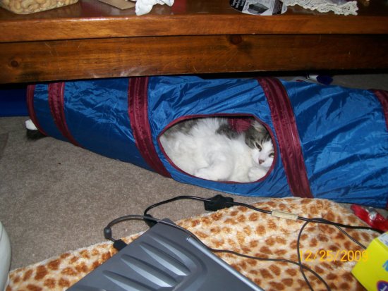 The red twinkle lights flash for a few seconds, every time the tunnel is moved in some manner. Other colors of this tunnel are sold today, and I do not know what color lights are inside them. Today the tunnel holds open a particular room door, so it cannot shut, and trap cats inside. Recently, the lights finally stopped working. It was not a battery problem, and I cannot fix them. The lights worked for years. The tunnel is still a good item without the lights. From the photo below, you can see I owned the tunnel at Christmas in 2009. Zeke is resting halfway through! In spite of the lights, it has held up very well. I recommend the tunnel with or without the lights. It sells for around $20 US.