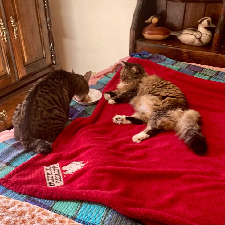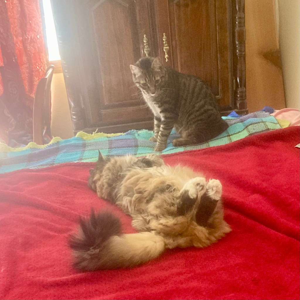 Nicholas is bigger. His tail has gotten bigger in proportion to his body getting bigger. He mostly holds his tail pointing right like he is signaling a turn. He still won’t let me pet him but he hangs out near me. He grabs my leg if I am too slow dishing out dinner, and one day picking up a food dish, he slapped it out of my hand. Opie sometimes lets him eat her food. He is constantly talking and likes to chase balls thrown on the stairs.