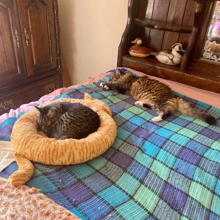 Cat Gallery. It is difficult to take action photos so these are pretty tame. Videos have not been so hard. My video channel on YouTube is @thecatcatio2593. Put this in the YouTube search box. All I have ever done with it is to post videos from it on here. The actual cat catio is a shambles presently. Nicholas could get out. I think Opie’s female instincts have switched on, and she knows Nicholas is a know nothing kitten, so she is playing and watching after him. Nicholas has different sleeping spots depending on the time. I was sitting beside his sleeping spot and he jumped up right next to me and went to sleep. I wanted to touch him which he does not allow, but I didn’t press my luck. I can walk by him without him running off. I will bide my time until he comes to me.